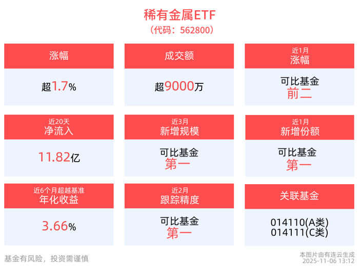 数据显示,截至2025年10月31日,中证稀有金属主题指数前十大权重股分别为北方稀土、洛阳钼业、华 友钴业、盐湖股份、赣锋锂业、天齐锂业、中矿资源、中国稀土、西部超导、厦门钨业,前十大权重股 合计占比60%。 截至2025年11月6日 13:12,中证稀有金属主题指数强势上涨1.89%,成分股西藏矿业上涨7.98%,云南 锗业上涨6.13%,赣锋锂业上涨4.12%,洛阳钼业、西部超导等个股跟涨。稀有金属ETF(562800)上涨 1.77%,盘中涨超2%。 流动性方面,稀有金属ETF盘中换手2.61%,成交9967.47万元。拉长时间看,截至11月5日,稀有金属 ETF近1月日均成交3.22亿元,居可比基金第一。 规模方面,稀有金属ETF近3月规模增长25.49亿元,实现显著增长,新增规模位居可比基金第一。份额 方面,稀有金属ETF近1月份额增长13.99亿份,实现显著增长,新增份额位居可比基金第一。资金流入 方面,稀有金属ETF最新资金净流入2783.60万元。拉长时间看,近20个交易日内,合计"吸金"11.82亿 元。 截至11月5日,稀有金属ETF近3年净值上涨6.18%。从收益能力看,截至2025年1 ...
