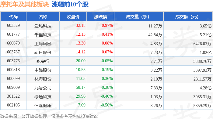 Market Overview - On November 7, the motorcycle and other sectors fell by 0.91%, with Zhenghe Industrial leading the decline [1] - The Shanghai Composite Index closed at 3997.56, down 0.25%, while the Shenzhen Component Index closed at 13404.06, down 0.36% [1] Stock Performance - Notable stock performances included: - Aima Technology (603529) closed at 32.18, up 0.97% with a trading volume of 112,700 shares and a turnover of 365 million yuan [1] - Zhenghe Industrial (003033) closed at 75.71, down 4.72% with a trading volume of 21,400 shares and a turnover of 165 million yuan [2] - Longxin General (603766) closed at 13.73, down 3.78% with a trading volume of 260,400 shares and a turnover of 362 million yuan [2] Capital Flow - The motorcycle and other sectors experienced a net outflow of 52.52 million yuan from main funds, while retail investors saw a net inflow of 56.14 million yuan [2] - The capital flow for specific stocks showed: - Aima Technology had a main fund net inflow of 31.71 million yuan, while retail investors had a net outflow of 18.69 million yuan [3] - Zhenghe Industrial had a main fund net outflow of 4.30 million yuan, with retail investors seeing a net inflow of 10.68 million yuan [3]