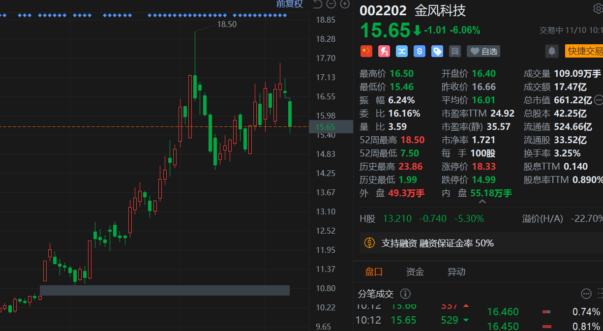 | 前复权 `)(-)(+) | 002202 金风科技 | | | | --- | --- | --- | --- | | 18.85 18.50 | 15.65 4 -1.01 -6.06% | | | | 18.28 | | | | | 17.70 | * 7 2 3 3 5 同 ♥ 白选 | | | | 17.13 | 最高价 16.50 | 开盘价 16.40 | 历史 | | | 最低价 15.46 | 昨收价 16.66 | 历史 | | 16.55 | 振 幅 6.24% | 平均价 16.01 | 点击 | | 15.98 | 委 比 16.16% | 市盈率 TM 24.92 | 总服 | | 15.65 | 量 比 3.59 | 市盈率(静) 35.57 | 流道 | | 15.40 | 52周最高 18.50 | 市净率 1.721 | 流道 | | 14.83 | 52周最低 7.50 | 色 主 100股 | 换 | | 14.25 | 历史最高 23.86 | 涨停价 18.33 | 股息 | | | 历史最低 1.99 | 跌停价 14.99 | | | 13.67 | 外 盘 ...