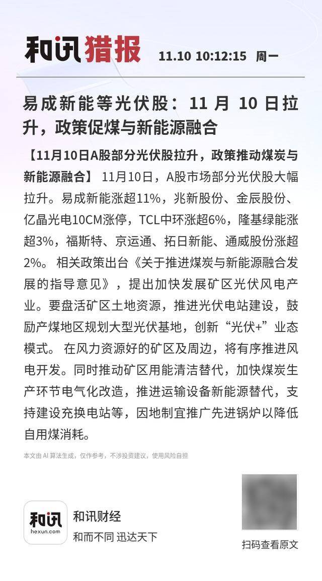 【11月10日A股部分光伏股拉升,政策推动煤炭与新能源融合】11月10日,A股市场部分光伏股大幅拉 升。易成新能涨超11%,兆新股份、金辰股份、亿晶光电10CM涨停,TCL中环涨超6%,隆基绿能涨超 3%,福斯特、京运通、拓日新能、通威股份涨超2%。 相关政策出台《关于推进煤炭与新能源融合发展 的指导意见》,提出加快发展矿区光伏风电产业。要盘活矿区土地资源,推进光伏电站建设,鼓励产煤 地区规划大型光伏基地,创新"光伏+"业态模式。 在风力资源好的矿区及周边,将有序推进风电开发。 同时推动矿区用能清洁替代,加快煤炭生产环节电气化改造,推进运输设备新能源替代,支持建设充换 电站等,因地制宜推广先进锅炉以降低自用煤消耗。 本文由 AI算法生成,仅作参考,不涉投资建议,使用风险自担 和讯财经 hexun.co 和而不同 迅达天下 扫码查看原文 目用煤消耗。 本文由 Al 算法生成,仅作参考,不涉投资建议,使用风险自担 ...