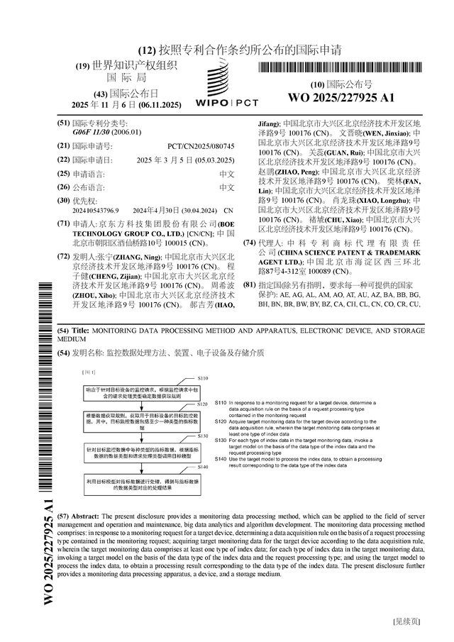 京东方A公布国际专利申请:“监控数据处理方法、装置、电子设备及存储介质”