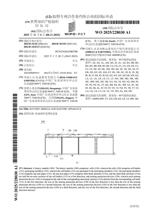 比亚迪公布国际专利申请:“电池组件及用电设备”