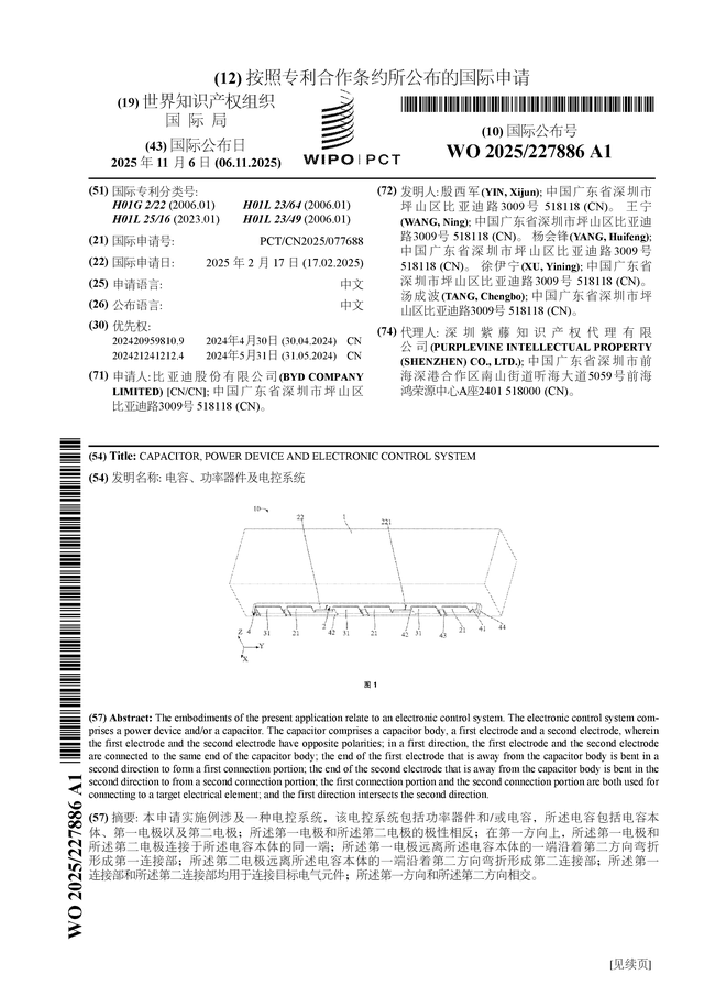 证券之星消息,根据企查查数据显示比亚迪(002594)公布了一项国际专利申请,专利名为"电容、功率器件及电控系统",专利申请号为 PCT/CN2025/077688,国际公布日为2025年11月6日。 相关ETF A50ETF (产品代码: 159601) ★ 跟踪:MSCI中国A50互联互通人民币指数 近五日涨跌: 0.56% 专利详情如下: | (12)按照专利合作条约所公布的国际申请 | | --- | | (19)世界知识产权组织 . | | 国际同 (10)国际公布号 | | (43) 国际公布日 WO 2025/227886 A1 2025年11月6日(06.11.2025) WIPO PCT | | (51) 国际专利分类号: (72)发明人:殷西军(YIN,Xijun):中国广东省深圳市 H01G 2/22 (2006.01) H01L 23/64 (2006.01) 坪山区比亚迪路3009号 518118(CN)。王宁 | | H01L 25/16 (2023.01) H01L 23/49 (2006.01) (WANG,Ning);中国广东省深圳市坪山区比亚迪 | | 路3009号 518 ...