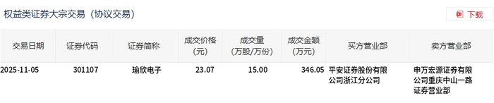 瑜欣电子今日大宗交易折价成交15万股,成交额346.05万元
