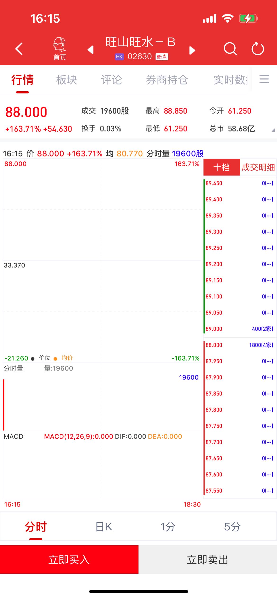 | 88.000 | 163.71% | 十档 | 成交 | | --- | --- | --- | --- | | | | 89.450 | | | | | 89.400 | | | | | 89.350 | | | | | 89.300 | | | | | 89.250 | | | 33.370 | | 89.200 | | | | | 89.150 | | | | | 89.100 | | | | | 89.050 | | | | | 89.000 | 400 | | | | 88.000 | 180( | | -21.260 ● 价位 ● 均价 | -163.71% | 87 950 | | 旺山旺水-B(02630)将于11月6日(周四)在香港挂牌。截至发稿,利弗莫尔证券暗盘交易显示报价88港元,较招股价33.37港元上涨163.71%,每手200股,不计 手续费,每手赚10926港元。 | 16:15 | | | | .Il ? CD | | --- | --- | --- | --- | --- | | 首页 | | 旺山旺水-B | ▲ HK 02630 暗盘 | Q C | | 行情 | 板 ...