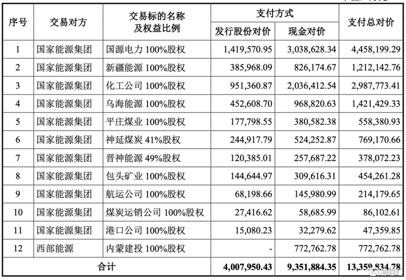 A股又要见证历史! 八千亿市值巨头重磅官宣千亿级大并购,震动资本市场。 12月19日晚间,中国神华连发88份公告,一口气买了12家企业,整体交易对价1335.98亿元。 毫无疑问,此举将成为近年来规模最大的资产收购案之一。 截至当日收盘,中国神华报收于40.59元,总市值超8064.63亿元。 千亿级大并购来了! 一艘亿吨级能源新航母驶来。 中国神华此次交易拟通过发行A股及支付现金方式,收购控股股东国家能源集团旗下12家核心资产。 此次交易价格高达1335.98亿元,交易对价的整体股份和现金支付比例分别为30%、70%。 其中,拟以发行对价股份方式支付人民币400.8亿元,以现金方式支付人民币935.19亿元。 据公告,交易包括购买国家能源集团持有的国源电力100%股权、新疆能源100%股权、化工公司100%股权、乌海能源100%股权、平庄煤业 100%股权、神延煤炭41%股权、晋神能源49%股权、包头矿业100%股权、航运公司100%股权、煤炭运销公司100%股权、港口公司100%股 权,并以支付现金的方式购买西部能源持有的内蒙建投100%股权。 同时,中国神华拟向不超过35名特定投资者发行A股股份募集配套 ...