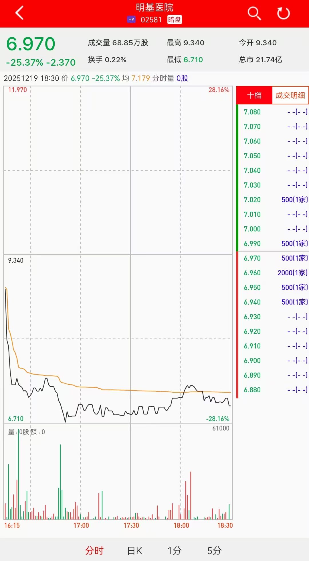 18:30 TITT 17:30 16:15 18:00 17:00 स्थिय 日K 1分 5分 • 行情来源: 利弗莫尔证券 • 智通财经APP获悉,明基医院(02581)将于2025年12月22日(星期一)在香港挂牌。截至收盘,利弗莫尔证券暗盘交易显示报价6.97港元,较招股价9.34港元 下跌25.37%,每手500股,不计手续费,每手亏1185港元。 | 明基医院 ( HK 02581 暗盘 | | ಇಂ | | | --- | --- | --- | --- | | 6.970 成交量 68.85万股 最高 9.340 | | 今开 9.340 | | | 最低 6.710 -25 37% -2 370 央于 0.22% | | 总市 21.74亿 | | | 20251219 18:30 价 6.970 -25.37% 均 7.179 分时量 0股 | | | | | 11.970 | 28.16% | 十档 | 成交明细 | | | | 7.080 | - -(- -) | | | | 7.070 | - -(- -) | | | | 7.060 | - -(- -) | | | | 7.05 ...
