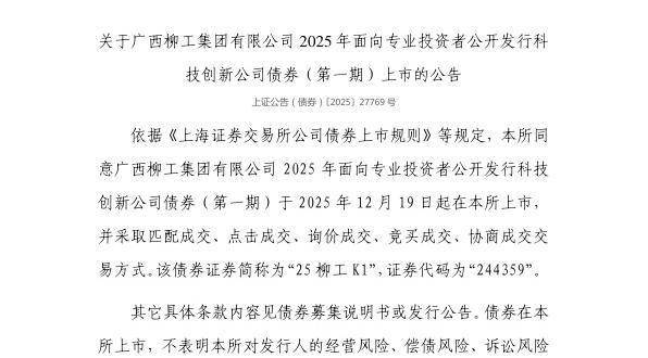 12月18日,上交所发布关于广西柳工集团有限公司2025年面向专业投资者公开发行科技创新公司债券 (第一期)上市的公告。 依据《上海证券交易所公司债券上市规则》等规定,上交所同意广西柳工集团有限公司2025年面向专业 投资者公开发行科技创新公司债券(第一期)于2025年12月19日起在上交所上市,并采取匹配成交、点 击成交、询价成交、竞买成交、协商成交交易方式。该债券证券简称为"25柳工K1",证券代码 为"244359"。 来源:市场资讯 ...