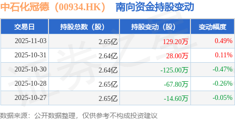 中石化冠德(00934.HK):11月3日南向资金增持129.2万股