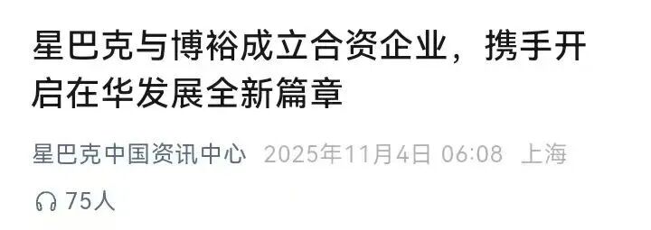 记者获悉,11月4日,星巴克公司宣布与另类资产管理公司博裕投资达成战略合作,双方将成立合资企 业,共同运营星巴克在中国市场的零售业务。 根据协议,博裕将持有合资企业至多60%股权,星巴克保留40%股权,并将继续作为星巴克品牌与知识 产权的所有者和授权方,向新成立的合资企业进行授权。基于约40亿美元(不计现金与债务)的企业价 值,博裕将获得其相应权益。 10月30日,星巴克发布2025财年第四季度(2025年7月1日至9月28日)及全财年业绩报告。全球大盘业 绩在四季度营收达到96亿美元,同比增长5%;2025财年的总营收达到372亿美元,同比增长3%。 中国市场的回暖迹象更明显:星巴克中国市场营业收入连续第四个季度增长,第四季度营收达到8.316 亿美元,同比增长6%;2025财年收入达到31.05亿美元,同比增长5%。 星巴克预计其中国零售业务的总价值将超过130亿美元,总价值由三部分构成:向博裕出让合资企业控 股权益所得、星巴克在合资企业中保留的权益价值,以及未来十年或更长时间内持续支付给星巴克的授 权经营收益。 对于中国业务部分股权出售事宜,星巴克首席执行官倪睿安当时在业绩电话会上强调,将保留星巴克中  ...