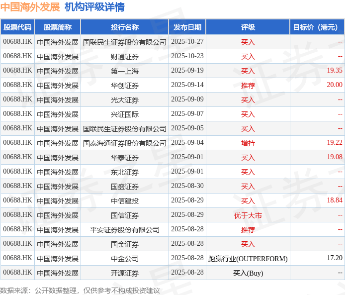 截至2025年10月31日收盘,中国海外发展(00688.HK)报收于13.03港元,下跌1.59%,成交量2256.24万 股,成交额2.96亿港元。投行对该股的评级以买入为主,近90天内共有11家投行给出买入评级,近90天 的目标均价为18.95港元。国联民生证券股份有限公司最新一份研报给予中国海外发展买入评级。 中国海外发展(00688.HK)公布,华夏中海商业资产封闭式基础设施证券投资基金(REIT,即该公告所指 公募基金)自2025年10月31日起于深圳证券交易所上市,交易代码为 180607.SZ。 机构评级详情见下表: | 股票代码 | 股票简称 | 投行名称 | 发布日期 | 评级 | 目标价 (港元) | | --- | --- | --- | --- | --- | --- | | 00688.HK | 中国海外发展 | 国联民生证券股份有限公司 2025-10-27 | | 买人 | | | 00688.HK | 中国海外发展 | 财通证券 | 2025-10-23 | 州 | | | 00688.HK | 中国海外发展 | 第一一课 | 2025-09-19 | 买人 | 19.35 ...
