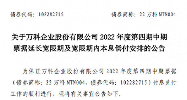22日晚,万科发布公告,表示公司2022年度第四期中期票据("22万科MTN004")展期一年的议案在12 月15日到期后,再次未获债券持有人通过。但债权人同意将本金和利息的支付宽限期由原本的5个交易 日大幅延长至30个交易日,截止日期顺延至2026年1月28日。 万科这笔债券展期一年的议案,此前为何两次均未获通过,持有人主要的担忧是什么?据智通财经报 道,一位房地产行业分析师向记者表示,这其中或反映出投资人对万科偿债能力信心不足。"当前房地 产市场持续调整,万科经营性现金流改善有限,且2026年仍有大规模债务到期,债权人担忧展期只 是'拖延时间',未来仍不排除可能会违约的概率。 "而按照市场上公开的最新信息,万科在第二次持有人会议上,并未能拿出令债权人满意的"新筹码"。 虽然公司承诺在宽限期内支付6000万元的到期利息,并提出了本金展期12个月的方案,但核心争议点在 于增信措施的缺失。 目前对万科来说最为紧迫的事情,就是需要在这短暂而宝贵的缓冲期内,推动新展期方案获得通过。 这意味着,万科在1月28日前无需立即支付该笔票据的本金和利息,也不必承担违约带来的额外财务成 本,为万科的现金流提供了缓冲时间。 然而 ...