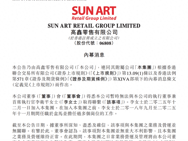 来源:环球网 【环球网消费报道 记者 李文瑶】2月4日早间,高鑫零售在港交所发布公告,公告称,公司暂时无法与 执行董事兼首席执行官李卫平女士取得联系。 高鑫零售方面表示,为确保公司运营的稳定性与连续性,目前相关经营管理工作已由高鑫零售董事会主 席华裕能先生统筹代管,四大区区总和集团高管紧密协同配合,全面保障各项管理工作平稳落地、业务 有序推进。 据了解,李卫平于2025年12月1日正式加入高鑫零售。在加入高鑫零售前,李卫平曾于2018年9月至2025 年11月期间在盒马担任不同职位,积累了丰富的零售管理经验。 对此,高鑫零售方面对记者给出管理层相关情况的说明。说明称,当前,公司各项经营活动正常有序推 进,年货销售旺季相关工作稳步开展,商品供应、服务保障等均未受到影响。 ...