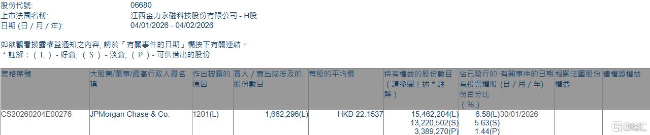 格隆汇2月4日丨根据联交所最新权益披露资料显示,2026年1月30日,金力永磁(06680.HK)遭JPMorgan Chase & Co.以每股均价22.1537港元减持好仓166.23万 股,涉资约3682.6万港元。 减持后,JPMorgan Chase & Co.最新持好仓数目为1546.22万股,持好仓比例由7.29%下降至6.58%。 | 股份代號: | 06680 | | --- | --- | | 上市法國名稱: | 江西金力永磁科技股份有限公司 - H股 | | 日期 (日 / 月 / 年): | 04/01/2026 - 04/02/2026 | | 麦格序號 | 大股東/董事/最高行政人員名 作出披露的 買入 / 賣出或涉及的 每股的平均價 | | | | 持有權益的股份數目 佔已發行的 有關事件的日期 | | | --- | --- | --- | --- | --- | --- | --- | | | 股份數目 | 農内 | | | (語參閱上述 * 註 | 有投票權股 (日 / 月 / 年) | | | | | | | | 优自分比 | | | | | | | | 96 ) | | ...