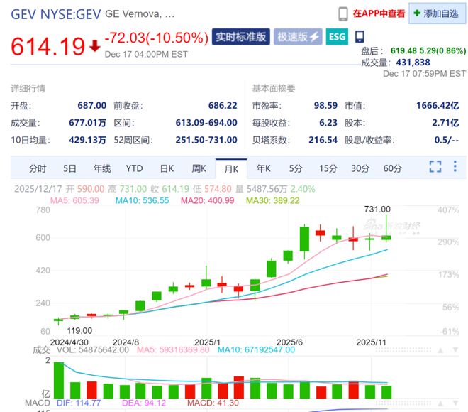 来源:市场资讯 (来源:电能革新) 12月15日,GE Vernova (GEV.US)股价大幅下挫,从最高的694美元下降到613.09美元,收盘价为614.19 美元,收跌10.5%,市值1666亿美元。当天GE Vernova 的市值损失达195亿美元,约1375亿元,超过中 国领先的输配电供应商思源电气、特变电工的市值。 GEV NYSE:GEV GE Vernova, ... + 添加自选 极速版 + ESG 614.19 + -72.03(-10.50%) 实时标准版 盘后: 619.48 5.29(0.86%) Dec 17 04:00PM EST 成交量:431,838 Dec 17 07:59PM EST 详细行情 基本面摘要 98.59 市值: 开盘: 687.00 前收盘: 686.22 市盈率: 1666.42亿 成交量: 677.01万 区间: 613.09-694.00 每股收益: 6.23 股本: 2.71亿 10日均量: 0.5/ -- 429.13万 52周区间: 251.50-731.00 贝塔系数: 216.54 股息/收益率: [] : 15分 分时 5日 年线 YTD ...