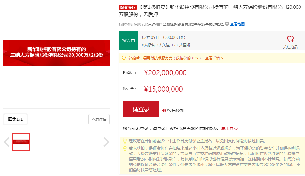 起拍价2亿元!新华联控股所持三峡人寿2亿股股份开拍在即