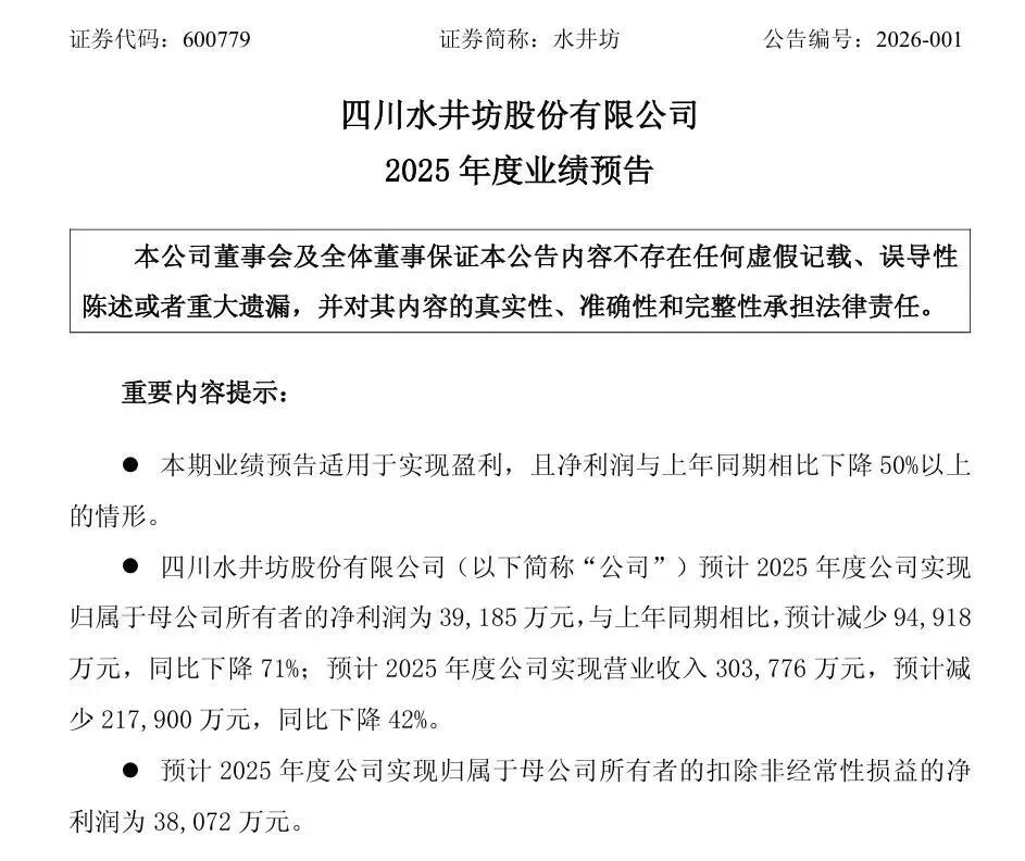 作为"川酒六朵金花"之一,水井坊正身处发展的关键挑战期。 近日,水井坊正式发布2025年度业绩预告,披露的经营数据呈现大幅下滑态势。公告显示,水井坊预计2025年实现营业收入为30.38亿 元,预计减少21.79亿元,同比下降42%;实现归母净利润为3.92亿元,预计减少9.49亿元,同比下降71%。 "在新渠道建设上,水井坊在即时零售、电商平台等已充分布局,与各线上平台也开展了深度合作,如与歪马送酒合作推出新零售专 属产品,与京东合作的产品上市活动也即将亮相等。"水井坊进一步透露,公司将围绕"平衡基础、深化调整、夯实发展"三个方向开展 主动管理,在维护渠道健康、优化市场结构、优化费用效率、改善各项生产力等方面积极实施各项措施,同时,保持对品牌建设、终 端拓展、产品创新及组织能力等方面的持续投入,为行业周期调整结束后的竞争力提升创造条件。 内有业绩下滑的经营压力,外有控股股东股权变动,身处行业调整周期的水井坊,每一步布局都关乎企业未来发展走向。 业绩入冬 水井坊2025 年度业绩预告截图 业绩承压之际,外资控股股东拟转让股权的市场传闻,更将水井坊推上舆论风口。 有消息称,帝亚吉欧正在考虑对其中国资产进行处置的 ...