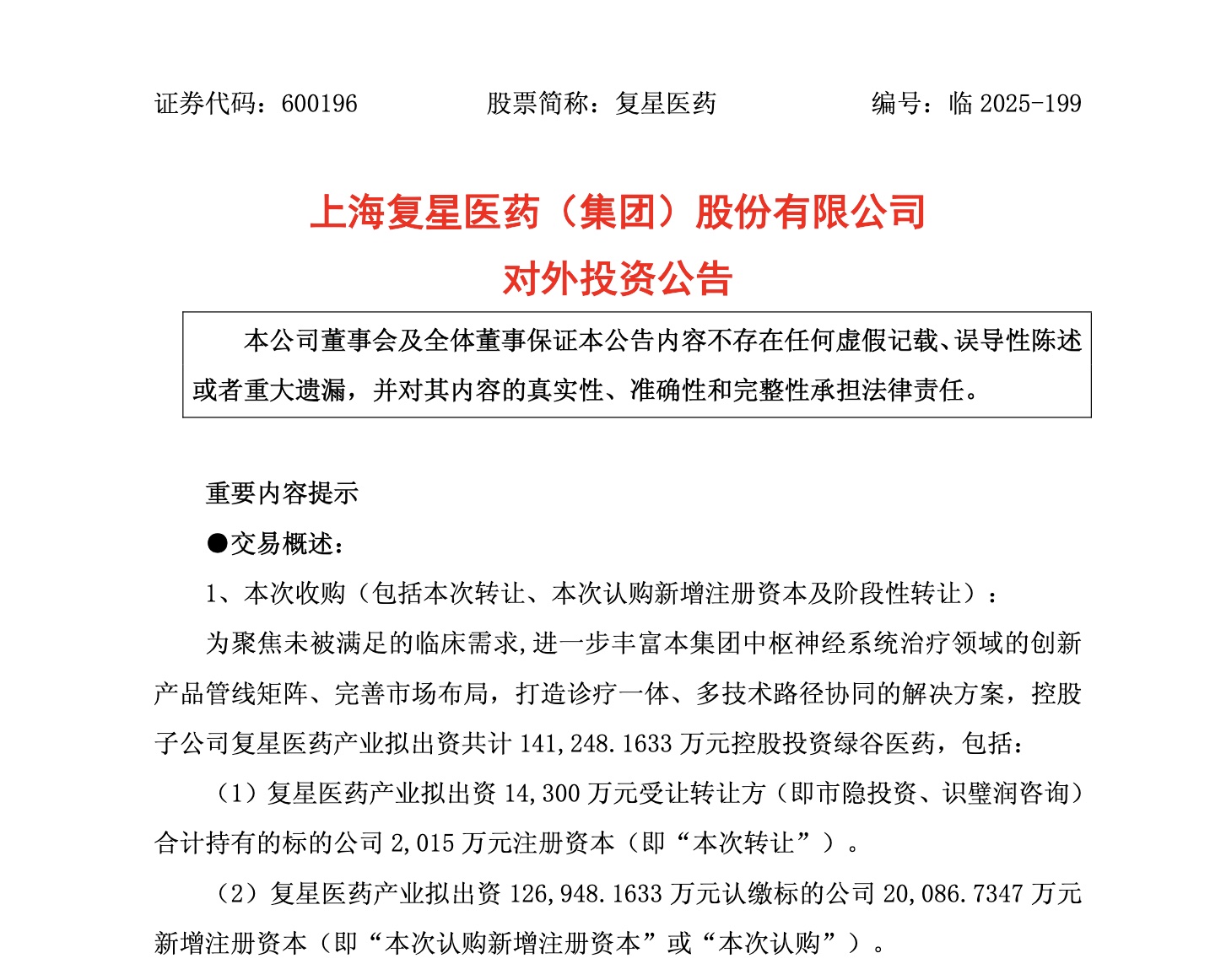 12月15日,上海复星医药(600196)(集团)股份有限公司发布公告,宣布控股子公司复星医药产业拟出资约14.12亿元人民币,控股收购绿谷(上海)医 药科技有限公司。 交易完成后,复星医药将持有绿谷医药53%股权,后者将纳入复星医药合并报表子公司范围。这笔交易的核心资产是绿谷医药旗下用于治疗轻度至中度阿尔 茨海默病的甘露特钠胶囊(商品名"九期一")。 值得注意的是,"九期一"的药品注册证书已于2024年11月到期,因未能按监管要求完成上市后确证性临床研究,国家药监局未予批准其再注册申请,该药物 自当月起已停止商业化生产。 绿谷医药2025年前三季度营收仅1.02亿元,净亏损6761万元,净资产缩水至1036万元。复星医药选择在标的公司经营陷入谷底、核心产品处于"休克"状态之 际出手,这一决策背后既有对中枢神经系统疾病庞大市场的长远布局考量,也承载着相当程度的研发和监管风险。这笔交易究竟是一次精准的价值洼地抄 底,还是一场胜算难测的高风险赌注?答案或许要等到"九期一"能否通过后续临床验证才能揭晓。 复星入局,阿尔兹海默病药"九期一"迎来命运拐点 近期,复星医药对绿谷制药的收购,再次将阿尔茨海默病药物"九期一" ...