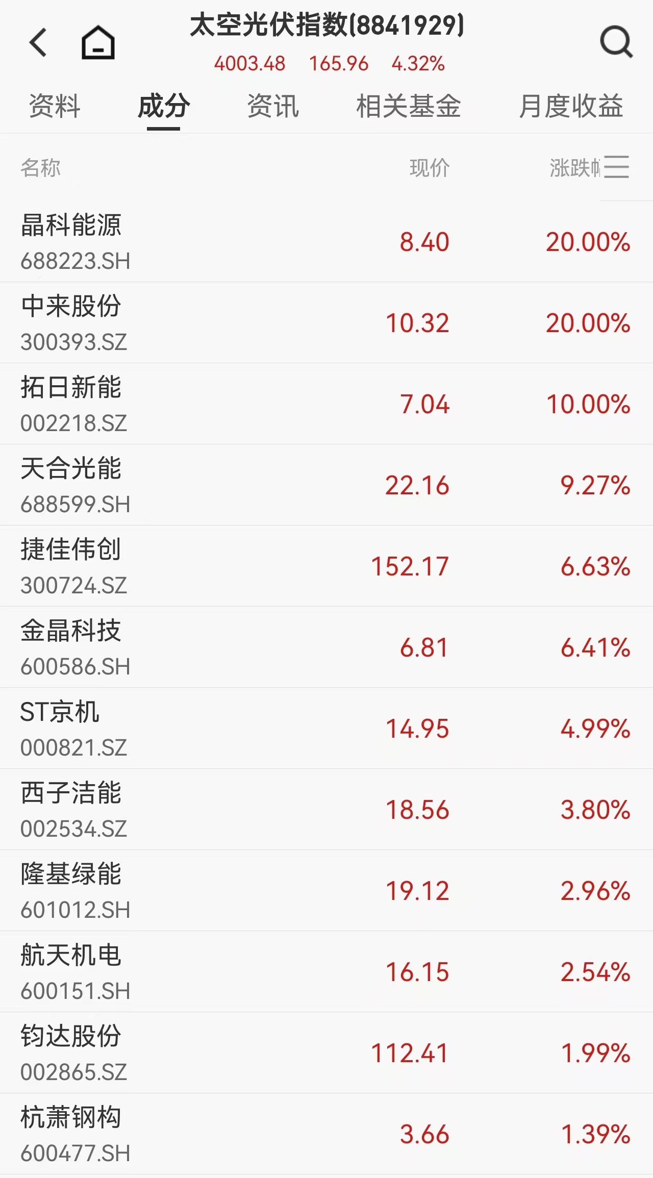 午后太空光伏(核心股)概念再度拉升,晶科能源20cm涨停,中来股份上午便已经20cm涨停,拓日新能上午涨停,天合光能涨超9%。 | < 日 | 太空光伏指数(8841929) | | | | --- | --- | --- | --- | | | 4003.48 165.96 4.32% | | | | 资料 | 资讯 相关基金 成分 | | 月度 | | 名称 | | 现价 | 污 | | 晶科能源 | | 8.40 | | | 688223.SH | | | | | 中来股份 | | 10.32 | 2 | | 300393.SZ | | | | | 拓日新能 | | 7.04 | | | 002218.SZ | | | | | 天合光能 | | 22.16 | | | 688599.SH | | | | | 捷佳伟创 | | 152.17 | | | 300724.SZ | | | | | 金晶科技 | | 6.81 | | | 600586.SH | | | | | ST京机 | | 14.95 | | | 000821.SZ | | | | | HTTH | 18.56 | | --- | --- ...