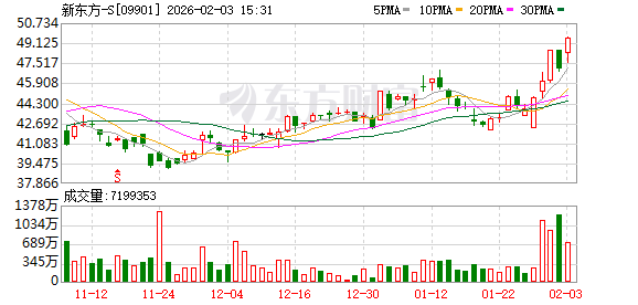 消息面上,新东方近日发布截至2025年11月30日止的2026财年第二季度财务业绩公告,净营收同比上升 14.7%至11.91亿美元;经营利润同比上升244.4%至6630万美元;股东应占净利润同比上升42.3%至4550 万美元。公司上调2026财年全年净营收指引至52.92-54.88 亿美元,同比增长8%-12%。 摩根大通重申新东方"增持"评级及首选股份地位,目标价由53港元升至55港元。大和认为,新东方2026 财年次季度业绩胜市场预期,主要受惠于其教育业务盈利能力改善及东方甄选的贡献。重申"买入"评 级,目标价由53港元升至57港元。美银证券则将其H股目标价由52.3港元升至55.6港元。 智通财经APP获悉,新东方-S(09901)涨近5%,高见49.36港元创逾1年新高。截至发稿,涨4.8%,报49.3 港元,成交额3.24亿港元。 ...