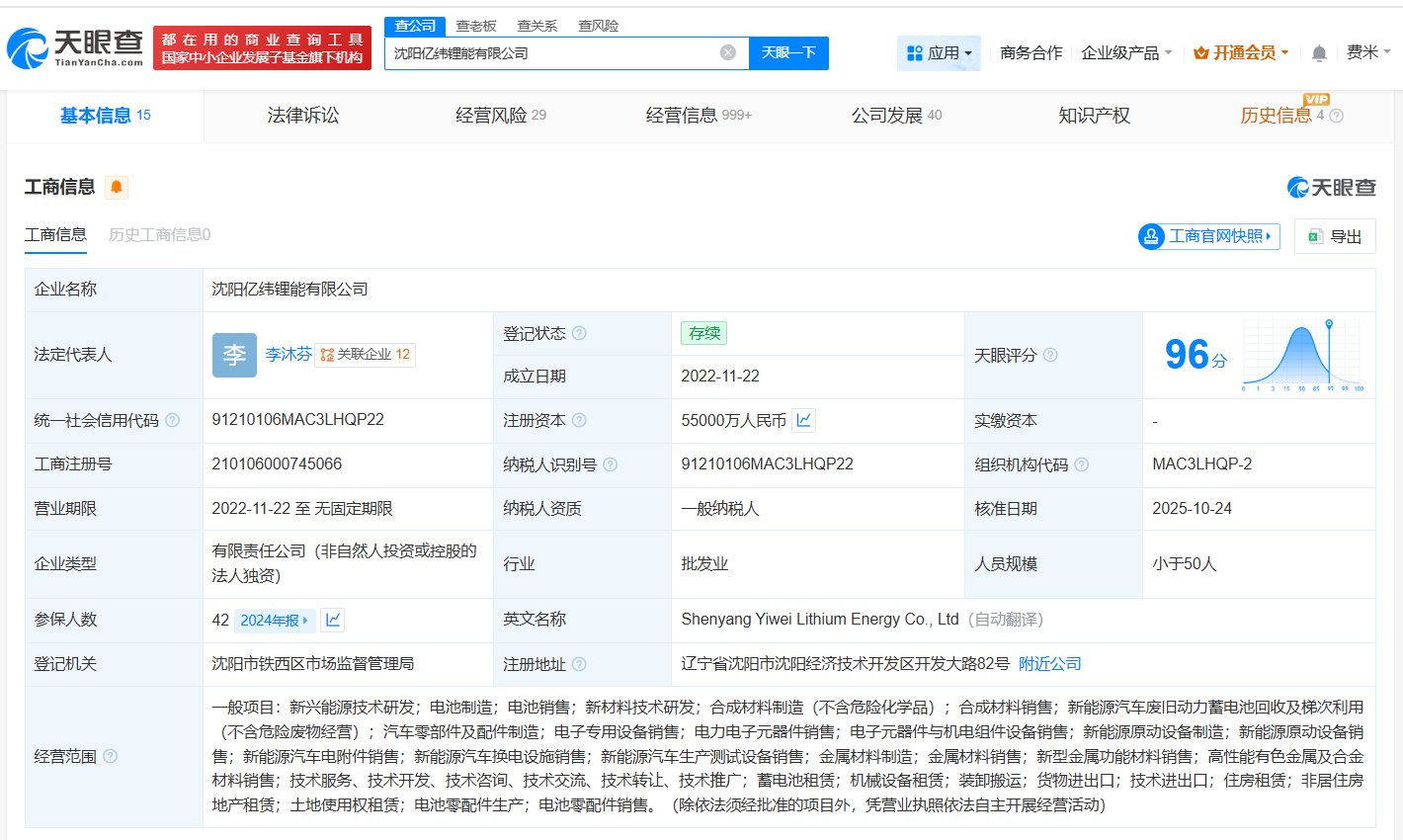 | | 意公司 都在用的商业查询工具 | 育老板 音关系 音风险 | | | | --- | --- | --- | --- | --- | | | 沈阳亿纬锂能有限公司 家中小企业发展子基金旗下机构 | | 8 天眼一下 | 船 应用 · 商务合作 : | | 基本信息 15 | 法律诉讼 | 经营风险 29 | 经营信息 999+ 公司发展 40 | 知 | | 工商信息 ● | | | | | | 工商信息 历史工商信息0 | | | | | | 企业名称 | 沈阳亿纬锂能有限公司 | | | | | 法定代表人 | 李沐芬 怒关联企业 12 Kh | 登记状态 2 | 存续 | 天眼评分 2 | | | | 成立日期 | 2022-11-22 | | | 统一社会信用代码 2 | 91210106MAC3LHQP22 | 注册资本 2 | 55000万人民币 区 | 实缴资本 | | 工商注册号 | 210106000745066 | 纳税人识别号 2 | 91210106MAC3LHQP22 | 组织机构代码 ( | | 营业期限 | 2022-11-22 至 无固定期限 | 纳税人资质 | 一般纳 ...