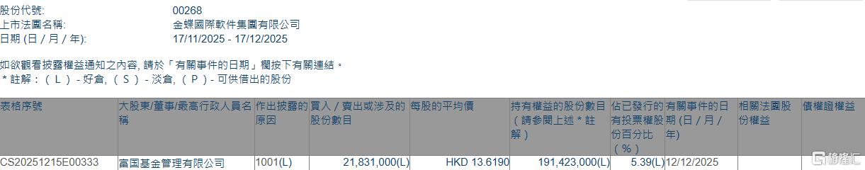 金蝶国际(00268.HK)获富国基金增持2183.1万股
