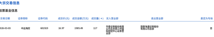 | 交易日期 证券简称 | | 证券代码 | 成交价(元) 成交金额[万元) 成交量( *) 买入营业部 | | 卖出营业部 | 是否为专场 | | --- | --- | --- | --- | --- | --- | --- | | 026-03-03 | 中运海控 | 601919 | 16.97 1985.49 | 117 2017 2017 | 用意表調度發驗份 | ка | 3月3日,中远海控大宗交易成交117万股,成交额1985.49万元,占当日总成交额的0.21%,成交价16.97 元,较市场收盘价16.97元持平。 ...
