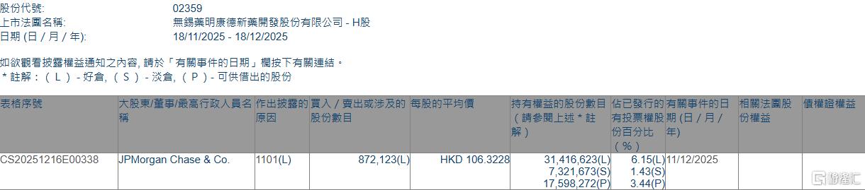 增持后,JPMorgan Chase & Co.最新持好仓数目为31,416,623股,持好仓比例由5.98%上升至6.15%。 | 股份代號: | 02359 | | --- | --- | | 上市法國名稱: | 無錫藥明康德新藥開發股份有限公司 - H股 | | 日期 (日 / 月 / 年): | 18/11/2025 - 18/12/2025 | 格隆汇12月18日丨根据联交所最新权益披露资料显示,2025年12月11日,药明康德(02359.HK)获JPMorgan Chase & Co.以每股均价106.3228港元增持好仓 87.21万股,涉资约9272.66万港元。 追加内容 本文作者可以追加内容哦 ! | FREE FREE | t 股東/董事/最高行政人員名 作出披露的買入 / 賣出或涉及的 每股的平均價 | | | | 持有權益的股份數目 佔已發行的有關事件的日 相關法則 | | --- | --- | --- | --- | --- | --- | | | 反新到三 | | | (植物城上面的船) | 有投票權股期 (日 / 月 / | | | | | | | 份自分市 年) | | ...