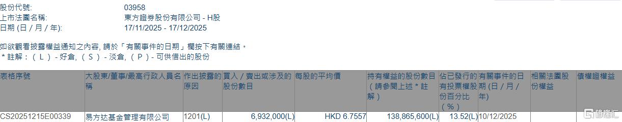 格隆汇12月17日丨根据联交所最新权益披露资料显示,2025年12月10日,东方证券(03958.HK)遭易方达基金管理有限公司在场内以每股均价6.7557港元减持 693.2万股,涉资约4683.05万港元。 | 表格序號 | 大股東/董事/最高行政人員名 作出披露的買入 / 賣出或涉及的 每股的平均價 | | | | 持有權益的股份數目 佔已發行的有關事件的日 相關法國 | | --- | --- | --- | --- | --- | --- | | | 股份數目 | 原因 | | | ( 請參閱上述*註 有投票權股期(日/月/ 份權益 | | | | | | | 份百分比 年) | | CART A CONSULTION CONSULTION CONSULTION CONSULTION CONTRACTOR COLLECTION CONTRACTOR COLLECTION CONTRACTOR COLLECTION CONTRACTOR COLLECTION CONTRACTOR CONTRACT CONTRACT CONTRA | | | Acres of the control of the co ...