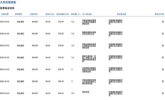 10月22日,恒立液压大宗交易成交108.1万股,成交额9324.69万元,占当日总成交额的14.86%,成交价 86.26元,较市场收盘价92.53元折价6.78%。 | 交易日期 | 证券調核 | 证券代码 | | | 成交价(元) 成交金额(万元) 成交量(*) 买入营业部 | | 类出营业部 | 是否为专场 | | --- | --- | --- | --- | --- | --- | --- | --- | --- | | 2025-10-22 | 恒立液压 | 601100 | 86.26 | 276.03 | 3.2 | | | KA | | 2025-10-22 | 恒立液压 | 601100 | 86.26 | 276.03 | 3.2 | North Andrew | 石原本 13 1 | 1631 | | 2025-10-22 | 恒立液压 | 601100 | 86.26 | 276.03 | 3.2 | | 石原本 13 1 | 종 | | 2025-10-22 | 恒立液压 | 601100 | 86.26 | 276.03 | 3.2 | 国)有限公司 | 石原本 11 20 | ...