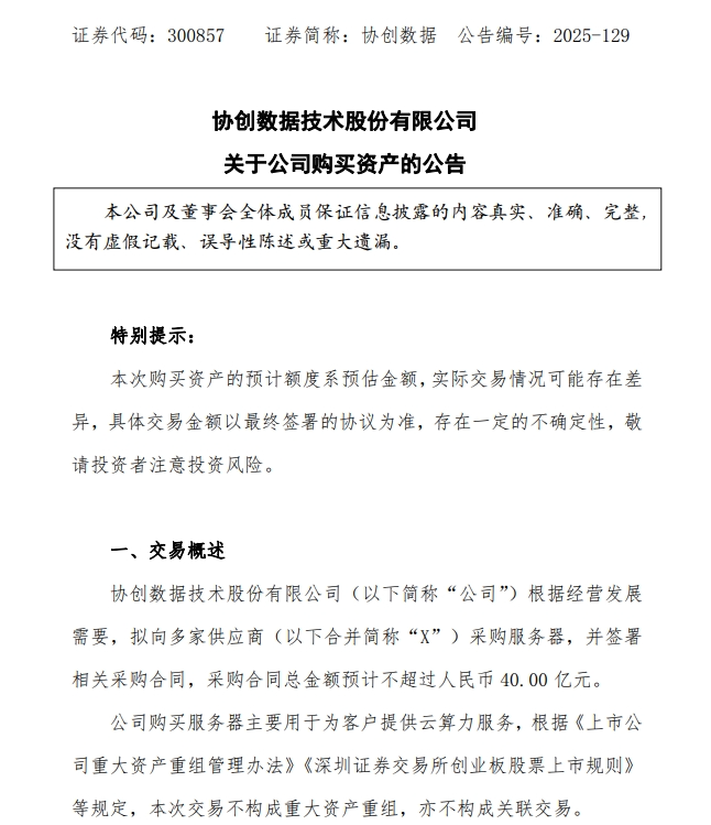 10月21日晚,协创数据(300857)发布公告称,公司根据经营发展需要,拟向多家供应商(合并简 称"X")采购服务器,并签署相关采购合同,采购合同总金额预计不超过40亿元。公司购买服务器主要 用于为客户提供云算力服务。公司当天召开第四届董事会第六次会议,全票审议通过上述购买资产的议 案。 10月21日晚间,协创数据还公告称,董事会会议通过了新增授信等事项。公告显示,由于业务量增加, 为满足公司及子公司日常经营和业务发展需要,公司及子公司拟新增向银行等金融或非金融机构申请不 超过人民币40亿元或等值外币的授信额度,并为子公司新增不超过人民币40亿元或等值外币的担保额 度。本次新增授信额度后,公司及子公司2025年度合计向银行等金融或非金融机构申请不超过人民币 245亿元或等值外币的授信额度。 图片来源:公司公告 公告称,出于商业秘密及战略发展考虑,按照规则披露交易对手方信息将导致违约或可能引致不当竞 争,因此公司根据相关规定对本次交易对方的相关信息履行豁免披露程序,不予披露交易对手方的具体 情况。交易价格为参考市场价格并经双方协商确认。公司将以公司自有资金、以现金转账方式完成上述 交易。 公告显示,40亿元的 ...