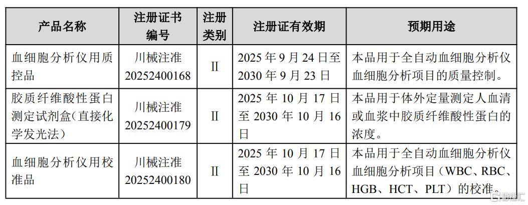 | 产品名称 | 注册证书 编号 | 注册 类别 | 注册证有效期 | 预期用途 | | --- | --- | --- | --- | --- | | 血细胞分析仪用质 | 川械注准 | II | 2025年9月24日至 | 本品用于全自动血细胞分析仪 | | 控品 | 20252400168 | | 2030年9月23日 | 血细胞分析项目的质量控制。 | | 胶质纤维酸性蛋白 | 川械注准 | II | 2025 年 10月 17 日 至 2030年 10月 16 | 本品用于体外定量测定人血清 | | 测定试剂盒(直接化 | 20252400179 | | | 或血浆中胶质纤维酸性蛋白的 | | 学发光法) | | | 日 | 浓度。 | | 血细胞分析仪用校 | 川械注准 | II | 2025 年 10月 17日 至 2030年 10月 16 | 本品用于全自动血细胞分析仪 血细胞分析项目(WBC、RBC、 | | 准品 | 20252400180 | | | | | | | | 日 | HGB、HCT、PLT)的校准。 | 格隆汇10月21日丨迈克生物(300463.SZ)公布,近日收到四川省药 ...