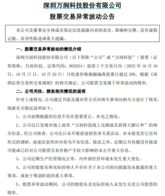 10月20日晚间,万润科技发布股票交易异常波动公告称,公司近日发现市场上流传"万润科技线上反路 演及获得大额订单"的相关信息,经公司核查,公司近日未开展前述投资者关系活动、亦未接受其它任 何形式的调研,前述信息所涉内容为不实信息。除此之外,近期公共传媒没有报道可能或已经对公司股 票交易价格产生较大影响的未公开重大信息。 万润科技今日涨停,全天成交额超22亿元,截至收盘,涨停板上封单仍超9万手。 | 17.24 | | 额 22.25亿 股本8.45亿 市盈 294.7 | | 万得 | | | --- | --- | --- | --- | --- | --- | | +1.57 | +10.02% | 换 15.87% 市值1 146亿 市净 9.38 | | 盘口 | | | 关闭4 | 五日 | 日K 周K 月K 更多 | | | | | 叠加 | | 盘口 | | 智能 | | | 17.24 | | 10.02% 卖5 | | | 0 | | | | 卖4 | | | 0 | | | | $3 卖2 | | | 0 0 | | 15.67 | | 0 000/ 2 == | | | 0 | | | ...