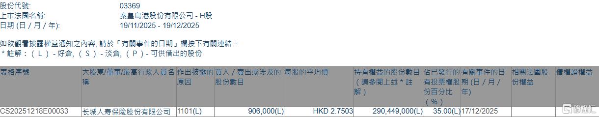 | 表格序號 | 大股東/董事/最高行政人員名 作出披露的買入 / 賣出或涉及的 每股的平均價 | | | 持有權益的股份數目 佔已發行的有關事件的日 相關法國 | | | --- | --- | --- | --- | --- | --- | | | 股份數目 | | | (請參閱上犹*註 | 有投票權股 期 (日 / 月 / | | | | | | | 份百分比 年) | | | | | | | 96 | | CS20251218E00033 | 长城人寿保险股份有限公司 1101(L) | 906,000(L) | HKD 2.7503 | 290,449,000(L) | 35.00(L) 17/12/2025 | 格隆汇12月19日丨根据联交所最新权益披露资料显示,2025年12月17日,秦港股份(03369.HK)获长城人寿保险股份有限公司在场内以每股均价2.7503港元增 持90.6万股,涉资约249.2万港元。 增持后,长城人寿保险股份有限公司最新持股数目为290,449,000股,持股比例由34.89%上升至35.00%。 | 股份代號: | 03369 | | --- | --- | | ...