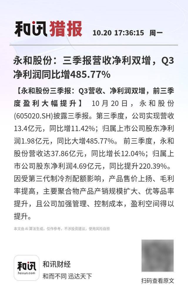 【永和股份三季报:Q3营收、净利润双增,前三季度盈利大幅提升】10月20日,永和股份(605020.SH) 披露三季报。第三季度,公司实现营收13.4亿元,同比增11.42%;归属上市公司股东净利润1.98亿元, 同比大增485.77%。 前三季度,永和股份营收达37.86亿元,同比增长12.04%;归属上市公司股东净利 润4.69亿元,同比提升220.39%。因受第三代制冷剂配额影响,产品售价上扬、毛利率提高,主要聚合 物产品产销规模扩大、优等品率提升,且公司加强管理、控制成本,盈利空间得以提升。 本文由 AI 算法生成,仅作参考,不涉投资建议,使用风险自担 和讯猎报 10.20 17:36:15 周一 【永和股份三季报:Q3营收、净利润双增,前三季 度盈利大幅提升】 10月20日,永和股份 (605020.SH)披露三季报。第三季度,公司实现营收 13.4亿元,同比增11.42%;归属上市公司股东净利 润1.98亿元,同比大增485.77%。前三季度,永和 股份营收达37.86亿元,同比增长12.04%;归属上 市公司股东净利润4.69亿元,同比提升220.39%。 因受第三代制冷剂配额影响,产品售价上扬 ...