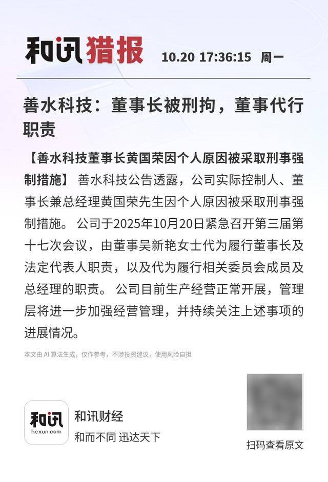 善水科技:董事长被刑拘,董事代行职责