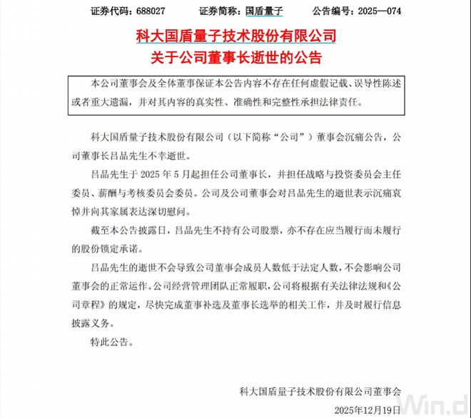 12月18日晚间,国盾量子(688027.SH)发布公告称,公司董事长吕品不幸逝世。 国盾量子称,吕品先生于 2025 年 5 月起担任公司董事长,并担任战略与投资委员会主任委员、薪酬与 考核委员会委员。公司及公司董事会对吕品先生的逝世表示沉痛哀悼并向其家属表达深切慰问。 截至公告披露日,吕品先生不持有公司股票,亦不存在应当履行而未履行的股份锁定承诺。吕品先生的 逝世不会导致公司董事会成员人数低于法定人数,不会影响公司董事会的正常运作。公司经营管理团队 正常履职,公司将根据有关法律法规和《公司章程》的规定,尽快完成董事补选及董事长选举的相关工 作。 来源:国盾量子 12月18日晚,"合肥高新公安"微博发布警情通报: 2025年12月18日13时许,我局接报警称,吕某(男,46岁)在望江西路与孔雀台路交口某公司一办公室 内失去意识。接警后,民警立即到场处置。经120现场确认,吕某已无生命体征。经公安机关勘查调 查,已排除案件。 警 情 通 报 2025年12月18日13时许,我局接报警称,吕 某(男,46岁)在望江西路与孔雀台路交口某公 司一办公室内失去意识。接警后,民警立即到场 处置。经120现场确认,吕某已 ...