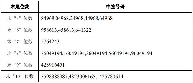 人民财讯10月20日电,锦浪科技(300763)10月20日披露可转债网上中签结果,中签号码共约43.21万个,每个中签号码只能认购10张(即1000元)锦浪转02。 转自:证券时报 | 末尾位数 | 中签号码 | | --- | --- | | 末"5"位数 | 84968,04968,24968,44968,64968 | | 末"6"位数 | 958613,458613,641322 | | 末"7"位数 | 5764243 | | 末"8"位数 | 76049194,16049194,36049194,56049194,96049194 | | 末"9"位数 | 423916451 | | 末"10"位数 | 5598388987.4323006165.1425780614 | ...