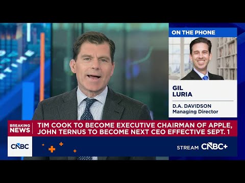 Yeah, stock just hesitating here down less than 1%. Uh, Gan, stay with us. Let's bring in Gil Lauria.He's analyst at DA Davidson. Gil, what's your first impression of of how an investor should think about this transition. >> Overall, I would say this is good news.To Jean's point, Tim Cook wouldn't be retiring at a time of crisis. He has an opportunity to walk away at a time with record iPhone sales uh and significant growth, a good upgrade year, and and a nice road map ahead. Uh the second big takeaway is t ...