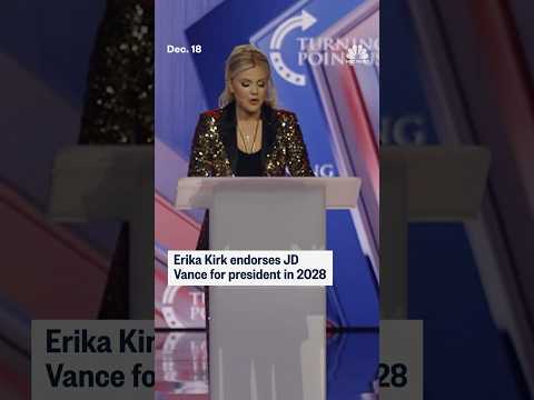 We are going to get my husband's friend JD Vance elected for 48 in the most resounding way possible. May still be 2025, but the 2028 presidential race is already getting underway. In a speech last night, Erica Kirk endorsed Vice President JD Vans, telling the crowd in Phoenix, quote, "We're going to get my husband's friend elected." Erica Kirk is the widow of Charlie Kirk, the Turning Point USA co-founder who was assassinated earlier this year.She took over as head of that organization which is one of the m ...