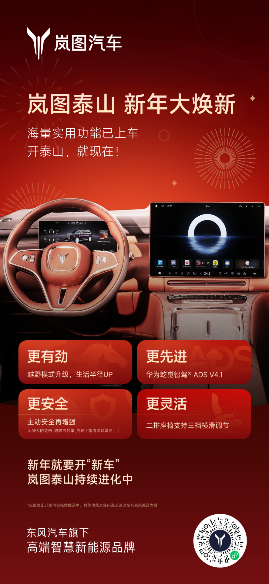 华为乾崑智驾ADS 4.1满血推送 华系智驾"卷王"诞生 2026年2月4日,岚图汽车向岚图泰山车主正式推送首次重大OTA升级!此次升级以华为乾崑智驾ADS 4.1为核心,覆盖智能座舱、辅助驾驶、越野性能三大 维度,用"商务+越野"双场景差异化优势,直接改写高端商务SUV的价值规则。 作为新时代旗舰大六座SUV,岚图泰山这次整车OTA不仅是产品力的全面进化,更精准戳中市场痛点——打破高端商务SUV"城市代步"的刻板印象,以华为 顶级智能辅助驾驶筑牢全场景安全防线,用同级人无我有的越野基因突破品类局限,在高端智能汽车赛道亮出硬核技术底气。 作为首批全量推送华为乾崑智驾ADS 4.1的车型,岚图泰山直接把华系高端车型的辅助驾驶拉到新高度——"别人有的我都有,别人强的我更强"!背靠华为 顶级智驾技术,岚图泰山以全场景适配性与主动安全优势实现全维领先,树立高端商务SUV新标杆。 岚图泰山的辅助驾驶功能中新增eAES防夹心功能,在跟车行驶过程中,能够提前预判前后两个方向的碰撞风险,在旁车道具备变道空间时辅助车辆自主变 道,规避车辆被前后车夹击的风险;新增急弯护航辅助功能,在预判车辆高速进入急弯、并存在碰撞风险时,将自动 ...