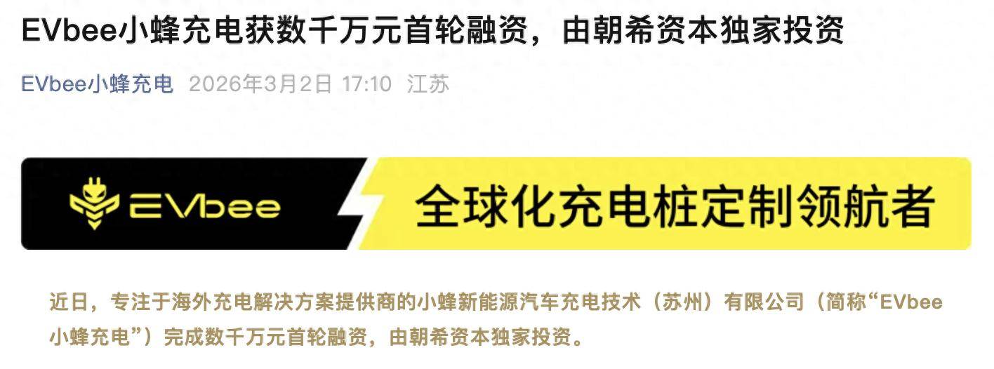 公开资料显示,EVbee小蜂充电成立于2020年,董事长杨涛系爱尔兰都柏林大学电力电子博士,先后供职于比亚迪、万马集团、浙江能源集团等一流的新能 源大型产业集团,对充电桩、储能和能源路由器有深刻的认知和理解,具有丰富的国际化市场开拓经验。 自成立之初,EVbee小蜂充电便锚定全球化发展战略,以长三角丰富的产业链配套和研发制造为基础,管理总部扎根海外。 瑞财经 吴文婷3月2日,专注于海外充电解决方案提供商的小蜂新能源汽车充电技术(苏州)有限公司(以下简称"EVbee小蜂充电")宣布完成数千万元首轮 融资,由朝希资本独家投资。 公司主营直流桩、交流桩、集成一体化储充系统以及配套的工商业储能系统等全品类产品,全系均严苛符合欧洲标准要求。目前,其已与多家海外知名桩 企、头部充电运营商达成深度合作,建立起长期稳固的战略合作关系。 ...
