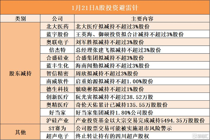 | | | 1月21日A股投资避雷针 | | --- | --- | --- | | 类别 | 公司 | 主要内容 | | 股东减持 | 北大医药 | 北大医疗拟减持不超过3%股份 | | | 蓝宇股份 | 王英海、御硕投资拟合计减持不超过3%股份 | | | 奥联电子 | 刘军胜拟减持不超过3%股份 | | | 倍杰特 | 总经理张建飞拟减持不超过3%股份 | | | 合盛佳业 | 合盛集团拟减持不超3%股份 | | | 蓝丰生化 | 海南闻勤拟减持不超过3%股份 | | | 智信精密 | 周欣拟减持不超过3%股份 | | | 南威软件 | 启重始源拟减持不超1.00%股份 | | | 德生科技 | 號晓彬拟减持不超过1%股份 | | | 创新医疗 | 阮光寅拟减持不超过38.52万股 | | | 奥精医疗 | 奇伦天佑累计已减持135.55万股股份 | | | 好当家 | 好当家集团减持1.80%公司股份 | | | 沪硅产业 | 产业投资基金以大宗交易完成减持5494.35万股股份 | | 其他 | ST赛为 | 公司股票交易可能被实施退市风险警示 | | | 超声电子 | 国商基 终止转让持有的四川超 ...
