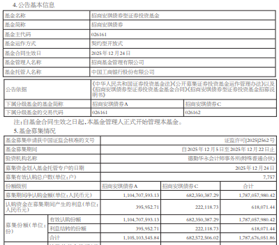 募集期间净认购金额1,787,057,980.42元,认购资金在募集期间产生的利息618,071.44元,募集份额 合计1,787,676,051.86份。 该基金拟任基金经理为尹晓红与蔡振。尹晓红2013年7月加入招商基金管理有限公司,曾任交易部 交易员;2015年2月工作调动至招商财富资产管理有限公司(招商基金全资子公司),任投资经理;2016 年4月加入招商基金管理有限公司,曾任高级研究员,现任基金经理。 蔡振2014年7月加入招商基金管理有限公司量化投资部,曾任ETF专员、研究员,主要从事量化投 资策略的研究,现任基金经理。 | 4.公司在中国公 | | | | | | | | --- | --- | --- | --- | --- | --- | --- | | 基金名称 | 招商安琪债券型证券投资基金 | | | | | | | 基金简称 | 招商安到债券 | | | | | | | 基金主代码 | 026161 | | | | | | | 基金进下方式 | 製的型开放式 | | | | | | | 基金合同生效日 | 2025年12月24日 | | | | | | | 基金管理人名称 | 招商基 ...