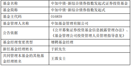 中加中债-新综合债券指数发起成立于2022年10月20日,截至2025年8月5日,其今年来收益率为0.95%, 成立来收益率为8.07%,累计净值为1.0807元。 | 基金名称 | 中加中债-新综合债券指数发起式证券投资基金 | | --- | --- | | 基金简称 | 中加中债-新综合债券指数发起式 | | 基金主代码 | 016859 | | 基金管理人名称 | 中加基金管理有限公司 | | 公告依据 | 《公开募集证券投资基金信息披露管理办法》 《基金管理公司投资管理人员管理指导意见》 | | 基金经理变更类型 | 增聘基金经理 | | 新任基金经理姓名 | 于跃先生 | | 共同管理本基金的其他基 | 王霜女士 | | 金经理姓名 | | 中国经济网北京8月6日讯今日,中加基金公告,中加中债-新综合债券指数发起式增聘于跃。 于跃2012年5月至2019年11月曾先后任民生证券股份有限公司固收投资经理助理;中信建投(601066) 证券股份有限公司固定收益投资经理。2019年12月加入中加基金管理有限公司,现任基金经理。 ...