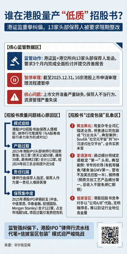 随着港股IPO申报热潮的到来,上市申请文件的质量隐忧正引发监管层的强力纠偏。 日前,香港证监会行政总裁梁凤仪透露,联合港交所向13家头部保荐人发出函件,要求其在三个月内完 成全面检讨及提交改善报告,内容包括部分上市文件的准备工作存在严重缺失,保荐人或有不当行为, 以及其资源管理严重失误。 据香港证监会披露,截至2025年12月31日,有16宗上市申请的审理流程已遭暂停。 这是近年来香港证监会对于保荐人罕见的监管重拳。 据信风与多名在港执业的资深投行人士交流获悉,港股IPO招股书的撰写工作通常"外包"给律师行,保 荐人则更多承担协调与承销职能。 随着IPO项目数量激增,律师行产能逼近极限,导致招股书频现低级失误。 但有行业人士向信风指出,鉴于律师行通常由保荐人指定,作为第一责任人的保荐人显然难辞其咎。 除质量把控缺失外,招股书的"过度包装"亦成为监管关注的另一焦点。 香港证监会亦指出,部分保荐人以复杂的专业词汇形容发行人的业务,或将部分公司包装成行业龙头 等。 随着此次监管部门的纠偏,保荐人将如何优化工作流程以提升招股书的质量,正受到关注。 律师行代笔 此次监管部门关注的焦点在于招股书的质量问题。 香港证监会发 ...