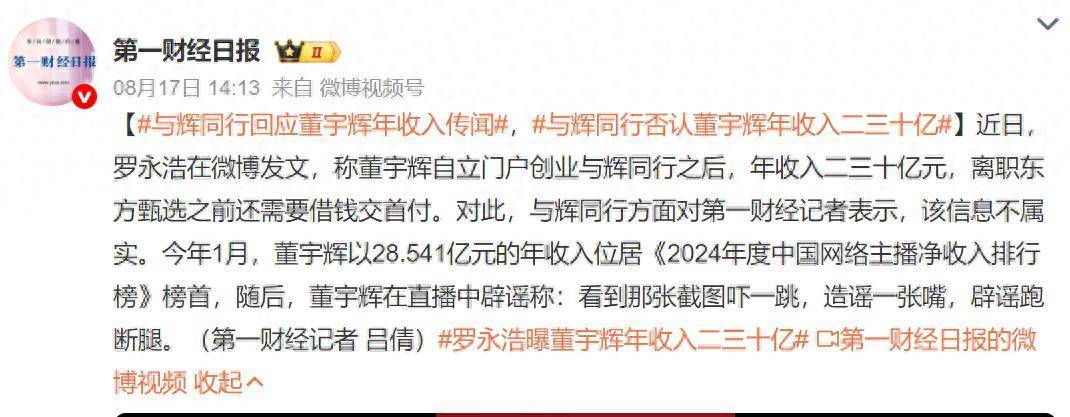 近日,罗永浩在微博发文称董宇辉自立门户创业与辉同行之后,年收入二三十亿元,离职东方甄选之前还需要借钱交首付。对此,与辉同行方面对第一 财经记者表示,该信息不属实。 据第一财经报道,今年1月,董宇辉以28.541亿元的年收入位居《2024年度中国网络主播净收入排行榜》榜首,随后,董宇辉在直播中辟谣称:看到那张 截图吓一跳,造谣一张嘴,辟谣跑断腿。(青云) 【环球网科技综合报道】8月18日消息,针对近日"罗永浩曝董宇辉独立后年收入二三十亿"相关消息,与辉同行方面对第一财经记者表示,该信息不属 实。 ...
