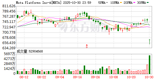 Core Viewpoint - The U.S. stock market opened lower on October 30, with mixed performance among major indices, while Meta's stock experienced a significant drop following its Q3 earnings report, highlighting concerns over profitability despite revenue growth [2][4]. Group 1: Market Performance - As of the report, the Dow Jones increased by 0.72% to 47,973.21 points, while the S&P 500 decreased by 0.29% to 6,870.71 points, and the Nasdaq fell by 0.92% to 23,738.86 points [2]. Group 2: Meta's Financial Performance - Meta reported Q3 revenue of $51.242 billion, a 26% year-over-year increase, but net profit dropped by 83% to $2.709 billion [4]. - The company anticipates Q4 total revenue between $56 billion and $59 billion, with capital expenditures projected to be between $70 billion and $72 billion, exceeding previous estimates of $66 billion to $72 billion [4]. Group 3: AI and Product Development - CEO Mark Zuckerberg indicated that the demand for computing power for Meta's AI projects is increasing, leading to higher spending on data centers and cloud services, which may yield significant profits in the long run [4]. - Meta launched its first consumer smart glasses, Meta Ray-Ban Display, priced at $799, which sold out quickly, and the CFO noted that revenue from AI glasses is expected to grow significantly in Q4 [4][5].