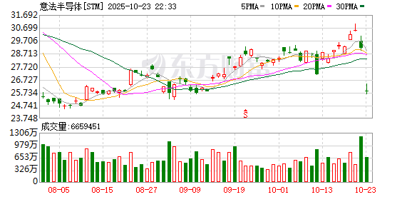 【导读】意法半导体熔断暴跌 大家好,简单关注一下半导体个股的消息。 这家向苹果和特斯拉供货的法意合资半导体公司周四在一份声明中表示,预计当前季度营收32.8亿美元,分析师平均预期为33.5亿美元。 自年初以来,随着特朗普发起贸易战并威胁开征广泛关税,芯片行业一直承压。另外,意法半导体的竞争对手德州仪器发布的业绩展望同样令投资者失 望。其前景显示,在日益加剧的贸易紧张与疲弱的经济环境下,客户正在减少下单。 公司与其他芯片制造商一直面临来自不同下游行业客户的需求波动:用于支撑人工智能所需数据中心的半导体需求旺盛,但对工艺相对不那么先进芯片的 订单更为低迷。 意法半导体上季度营收同比下降2%至31.9亿美元,期内营业利润下滑53%至1.8亿美元,低于预期。公司称,其中包括与此前宣布的降本计划相关的资产 减值与重组费用共3700万美元。 有分析师表示,尽管个人电子产品销售强劲,但利润率仍难言实质性修复。 在与投资者的电话会议上,意法半导体首席财务官洛伦佐·格兰迪表示,上半年产量较低,令制造效率受损,压制了利润率。他预计,随着本季度"更高的 营收水平"将"更好地填充产能",盈利能力会有所恢复。 10月23日,意法半导体 ...