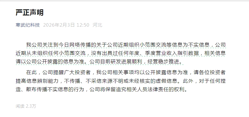 在股价大跌14%之后,赶在午后开盘之前,寒武纪紧急甩出一纸声明,回应小作文! 2月3日午间停盘阶段,寒武纪突然发布声明,回应网络传播的关于近期组织小范围交流等信息。寒武纪表示公司 近期从未组织任何小范围交流,没有出具过任何年度、季度营业收入指引数据,相关信息请以公司公开披露的信 息为准。公司目前研发进展顺利,经营稳步推进。 在声明中,寒武纪强调对于任何捏造、散布传播不实信息的行为,公司将保留追究相关人员法律责任的权利。同 时提醒广大投资者,我公司相关事项均以公开披露信息为准,请各位投资者提高信息辨别能力,不传播、不采信 来源不明或未经核实的虚假信息。 据21世纪经济报道,市场传言颇多。以寒武纪为例,一说是对平头哥竞争预期的担忧。另有说法称寒武纪最近组 织了一个小范围交流,今年营收指引是200亿元,而市场预期是300亿-500亿元,不及预期。 在午间寒武纪火速声明之后,午后寒武纪股价出现小幅拉升,跌幅一度收窄至10%以内。 | 寒武纪-U | | | | | | | --- | --- | --- | --- | --- | --- | | 688256 ₪ 南 | | | | | | | 1257.78 11 ...